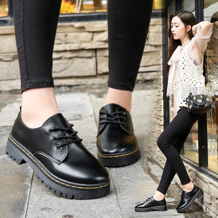View Full Women Black Leather Shoes Korea Wild Style Lace Up Shoes Shopee